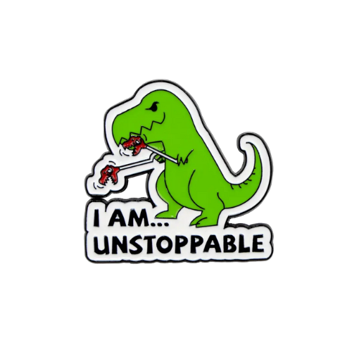 Meet the ultimate symbol of resilience! This enamel dinosaur pin boldly declares, "I Am Unstoppable", with a playful design that’s sure to make you smile. Featuring a quirky dino rocking its confident vibe, this pin is perfect for anyone who loves a mix of humour and prehistoric charm.