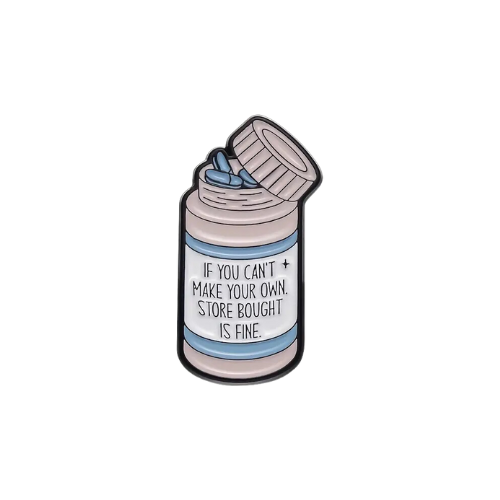 Whether it’s serotonin, happiness, or even a batch of cookies—sometimes, store-bought is just fine! This "If You Can’t Make Your Own, Store-Bought Is Fine" enamel pin is a playful and relatable way to embrace self-care, medication, or just taking shortcuts in life without guilt.