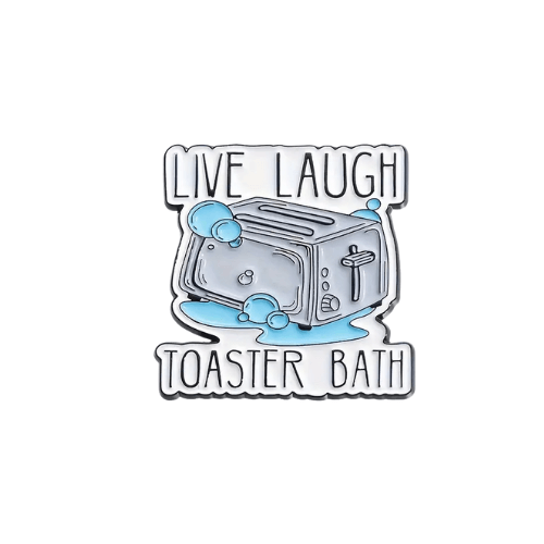 For those who like their humour extra dark, this "Live Laugh Toaster Bath" enamel pin delivers the ultimate edgy twist on a classic feel-good mantra. Featuring a smiling toaster and a bubbly bath, this pin is perfect for those who enjoy embracing life’s chaos with a side of sarcasm.