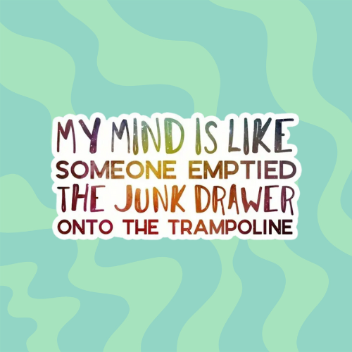 This witty sticker, "My Mind Is Like Someone Emptied the Junk Drawer onto the Trampoline," captures the essence of having a busy, bouncing mind with a touch of humour and understanding.