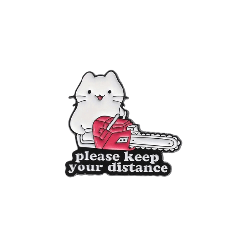 For those who like their personal space respected, this "Please Keep Your Distance" Chainsaw Cat enamel pin sends the message loud and clear—with a hilariously menacing twist. Featuring an adorable-yet-fierce cat wielding a chainsaw, this pin perfectly balances cute and intimidating vibes.